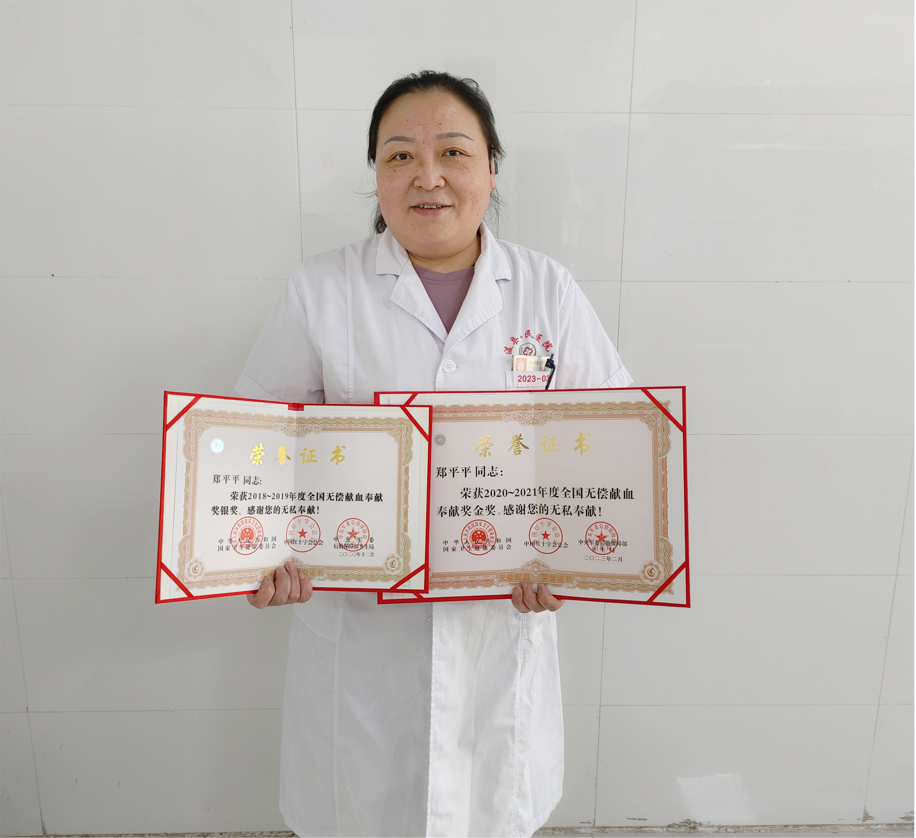 郑平平用自己的行动诠释着忠诚奉献的精神。从1998年至今,她累计献血四十多次,献血量高达一万多毫升。付出得到了社会的回报,她多次获得诸多荣誉,尤其在2018-2019年度和2020-2021年度分别荣获全国无偿献血奉献奖银奖和金奖。