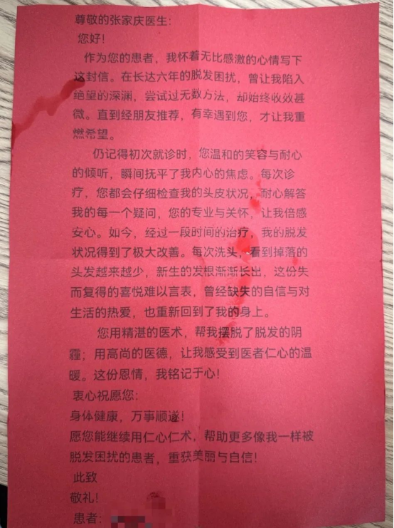 接诊医生张家庆,面对情绪低落的刘女士,耐心细致地为她进行全面检查,深入分析脱发病因,制定个性化的治疗方案,在后续诊疗过程中用温暖的话语鼓励刘女士积极面对。