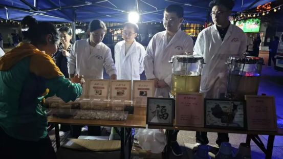 中药茶饮摊前,保温杯里泡着青春,00后小伙把“润肺茶”喝出手冲咖啡的仪式感;女士们围着“安神养肤茶”,交流广场舞后如何“面若桃花”。