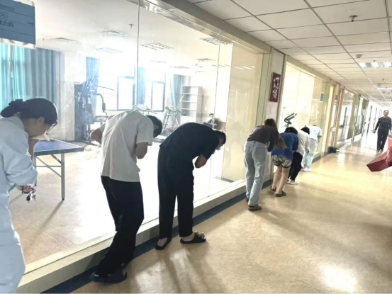 随着模拟烟雾升起和警报声拉响,实战化的应急疏散演练正式开始。全体医护人员立刻进入应急状态,按照预定预案,明确分工,迅速到达指定岗位。他们沉着冷静地引导患者,特别是对行动不便、情绪易波动的患者进行“一对一”帮扶,沿着最近的安全疏散通道,低姿、捂口鼻,快速、有序地向安全区域撤离。 整个演练过程指令清晰、行动迅速、配合默契,充分展现了科室医护人员高度的责任心和卓越的应急处理能力,也体现了患者们良好的秩序性与对医护人员的充分信任。
