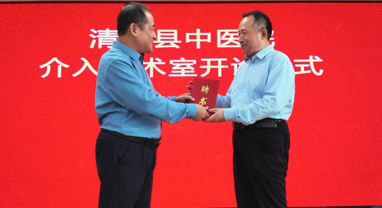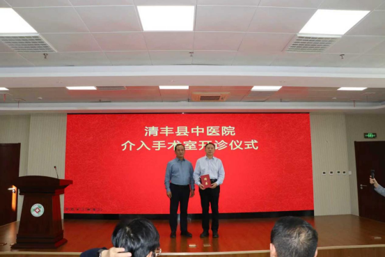 随后,孙立群为李忠银颁发了专家聘书。李忠银作为长期指导清丰县中医院心内科主任徐红杰的带教老师发表的讲话。他在发言中对中医院的发展及徐红杰的敬业和专业给予了充分肯定,对清丰县中医院介入手术室的顺利启用表达了由衷的欣慰与祝贺,并表示今后将一如既往全方位支持介入手术室的工作。