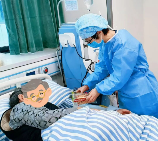 血液透析的过程漫长,但爱与陪伴始终在场。在这里,医护人员与患者朝夕相处,早已超越了普通的医患关系——他们更像是并肩作战的战友,也像是彼此牵挂的亲人。医务人员深知,长期透析的患者不仅承受着身体的负担,更面临着心理的压力。尤其在这样象征团圆的日子里,他们对“家”的思念愈发深切。一块小小的月饼,承载的不仅是节日的问候,更是医患之间真挚而深厚的情义。