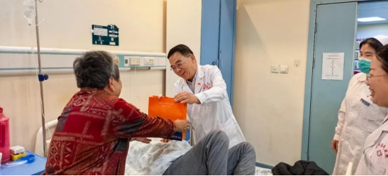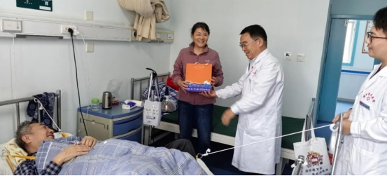 “老人家,中秋节快乐!祝您早日康复!”在病床前,靳相彬亲切地将月饼递给患者及家属,并与他们亲切交流,详细了解他们的治疗情况和康复进展。香甜的月饼,暖心的话语,让患者和家属的脸上露出了惊喜和感动的笑容,病房里充满了节日的温馨氛围。