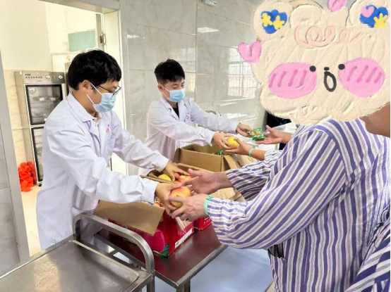 该院医护人员将提前准备好的水果、月饼、饮料等逐一分发给患者,还时不时叮嘱患者小心呛着、噎着。对于进食不能自理或进食困难的患者,护士们则细心地协助喂食。