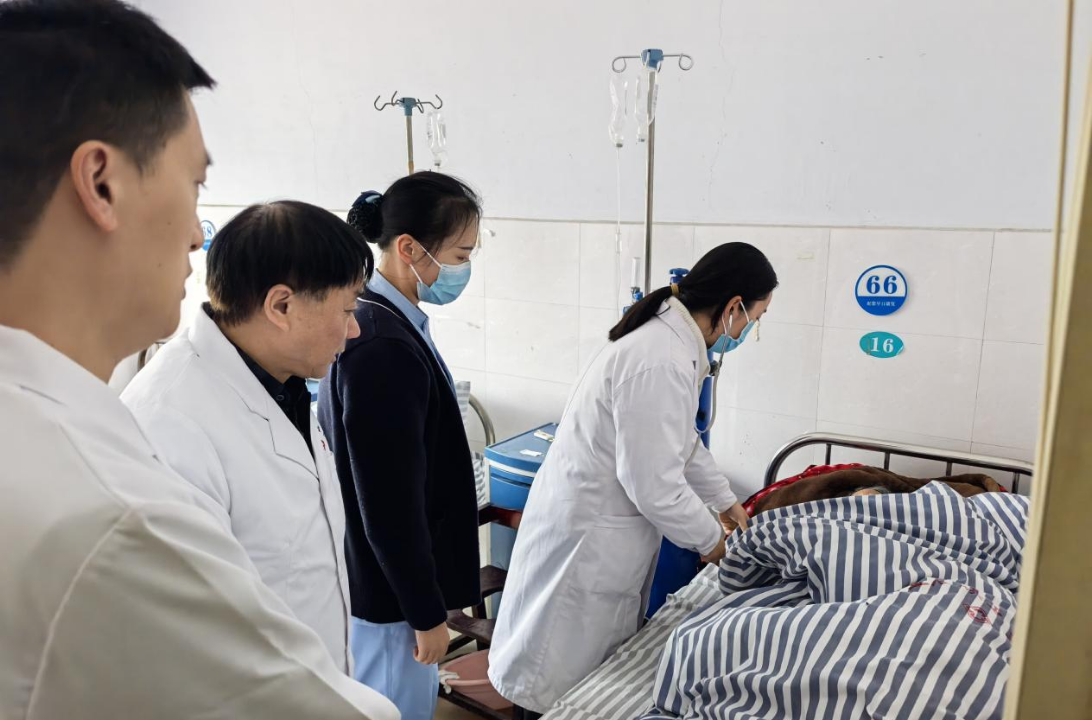 查房中,孟庙镇卫生院主管医生逐一汇报重点患者病史、症状体征、诊疗方案及恢复情况,条理清晰地呈现病历核心信息。随后,白雪与联合查房团队深入病房,来到患者床旁开展细致检查:她耐心询问患者病情变化与用药感受,细致核查体格检查关键要点,结合病历资料与临床经验,对诊断依据、治疗思路及用药合理性进行深度剖析。