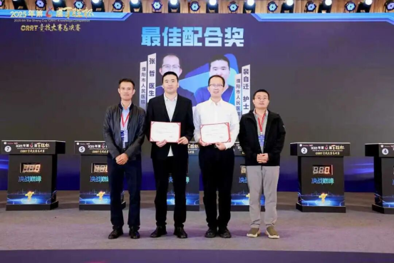 本次大赛由成都高新医学会主办,四川大学华西医院承办,采用线上线下融合模式,现场与会者逾200人,线上直播观赛实况互动达7.8万人次。自2025年7月21日启动以来,历时3个多月,来自全国28个省份、758家医院的2744名医护人员参与角逐。该院血液透析中心医护团队一路披荆斩棘,成功进入全国12强,并在“全国总决赛”荣获团体赛第二名(卓越奖),血液净化中心医生张哲、护士裴自迁以全场最高答题准确率斩获“最佳配合奖”。