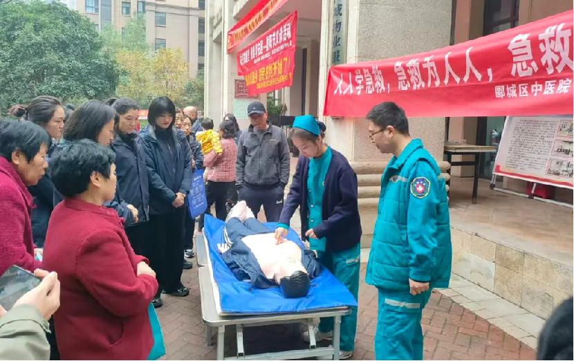 急诊科医护团队还以“人人学急救,急救为人人,急救知识进万家”为主题,开展急诊急救健康知识普及活动。考虑到老年群体突发心脏骤停、异物卡喉等风险较高,急诊科医护人员首先讲解了秋冬季节常见急症(如脑卒中、心梗)的早期识别要点,提醒居民“出现胸痛、肢体麻木等症状需及时就医”。随后,医护人员利用人体模拟人进行实操演示,详细拆解心肺复苏(CPR)的操作步骤,现场演示海姆立克急救法,分别示范成人、儿童及婴幼儿的操作差异,并邀请居民模拟练习,手把手纠正动作细节,确保大家能掌握正确的急救方法。
