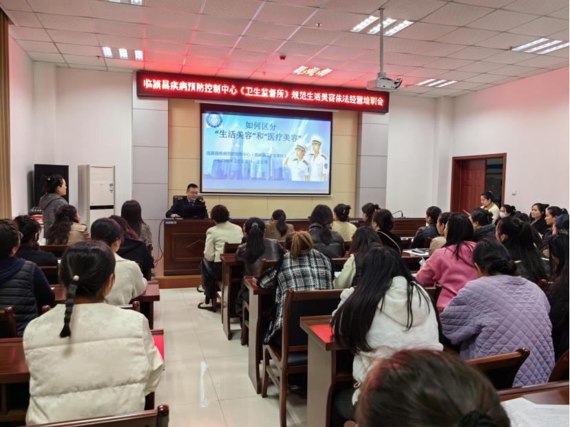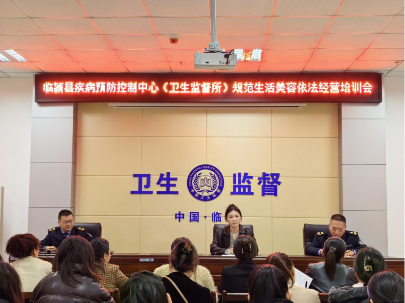 临颍县疾控中心主任(所长)、卫生监督所副所长、公共卫生监督科科长及公共卫生监督科监督执法人员和全县美容店负责人共计80余人参加培训会。