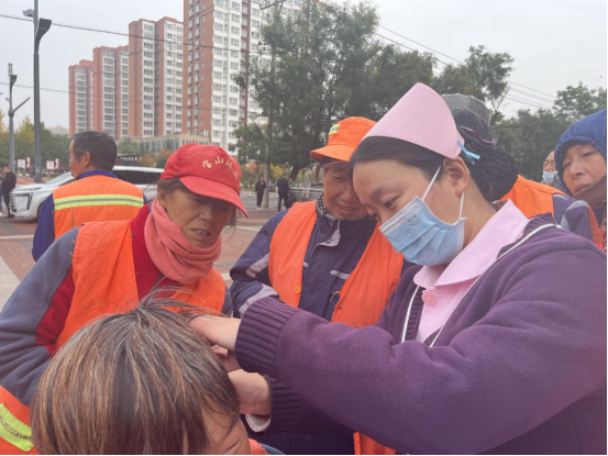活动现场,鹤壁市中医院骨科、心肺科、综合内科、正骨科、中医特色护理门诊等多个科室组成的专家义诊团队,针对环卫工人长期户外作业、易患颈肩腰腿痛、关节炎等职业病的特点,提供血压测量、中医体质辨识、把脉开方、推拿刮痧等专项服务。针对其户外劳作易引发的颈肩腰腿劳损,专家们进行了细致诊查与防护指导,并重点讲解了季节交替下粉尘防护与呼吸道疾病预防知识,帮助他们更好地应对职业常见病。此外,鹤壁市中医院的工作人员还为环卫工人现场发放了健康包。