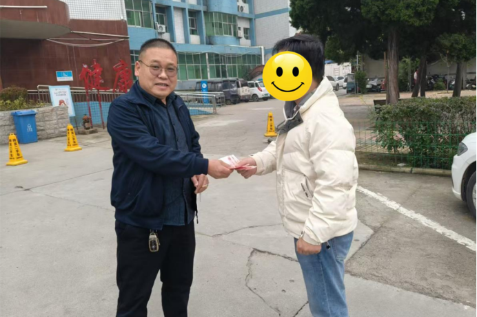 在行至病房楼前,卢进友意外发现一辆白色轿车旁散落500元现金。面对意外之财,他没有丝毫迟疑,第一时间将钱款原封不动送至医院办公室,详细说明捡拾地点与经过。院办工作人员高度重视,当即联动保卫科前往监控室调取视频,经逐帧细致排查,迅速锁定了不慎遗落钱款的失主杨先生。