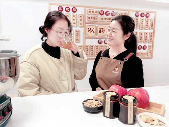 立冬进补,先护脾胃。11月7日立冬这天,灵宝市中医院药膳坊制作出一款山楂苹果膏,工作人员邀请市民品尝。该院药膳坊精选消食解腻的山楂,搭配润燥生津的苹果,制作的山楂苹果膏可以缓解立冬后饮食厚重带来的脾胃负担,让养生随节气而变。 朱晓娟 夏喜梅/摄