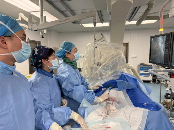 科主任熊晨晖主任医师带领主管医师刘正玉及全科医护人员,经过全面评估与病例讨论,决定为冯女士施行“经皮房颤射频消融+左心耳封堵”一站式手术。手术在河南省心电学会副主任委员黄琼教授现场指导及刘正玉主治医师的协作下,依托强生三维标测系统等国际先进设备,顺利实施并圆满完成。