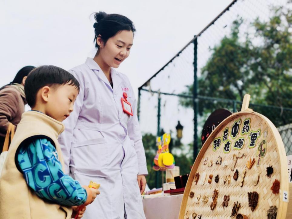 在中医药文化展示区,市民们纷纷驻足观看。通过中药饮片识别、中药茶饮品尝、中药香囊制作、中药耳环展示、中药足粉和中药贴体验等环节,市民们零距离接触中医药文化。一位带着孩子的家长在医务人员的引导下,耐心教孩子识别中药药材,让孩子从小接受中医药文化熏陶。