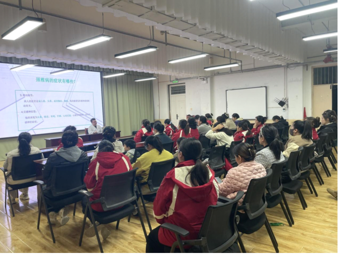 活动现场,来自李万社区卫生服务中心的中医师利用PPT图文展示,针对教师群体长期伏案工作引发的颈椎健康问题,结合临床经验,系统讲解了颈椎病的发病机制、常见分型及早期预警信号,重点剖析了不良工作姿势对颈椎的慢性损伤。同时,现场演示一套行之有效的缓解颈椎病的颈椎操,助力大家在繁忙的教学工作间隙,能够便捷地舒缓身体疲劳、放松紧张身心。科普结束后,中医师针对颈肩酸痛、慢性疲劳等职业病,让大家现场体验推拿、耳穴压豆等中医特色疗法,症状立竿见影,受到广泛好评。