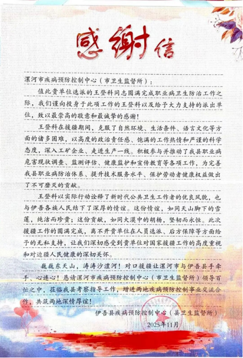2025-11-19 来源:医药卫生网 - 医药卫生报 浏览:次医药卫生网讯 2025年11月16日,漯河市疾控中心(卫生监督所)王登科在2025年度“小组团”柔性援疆专家人才项目中圆满完成援疆任务归来。他同时带回了伊吾县疾控中心主任亲笔书写的感谢信和锦旗。