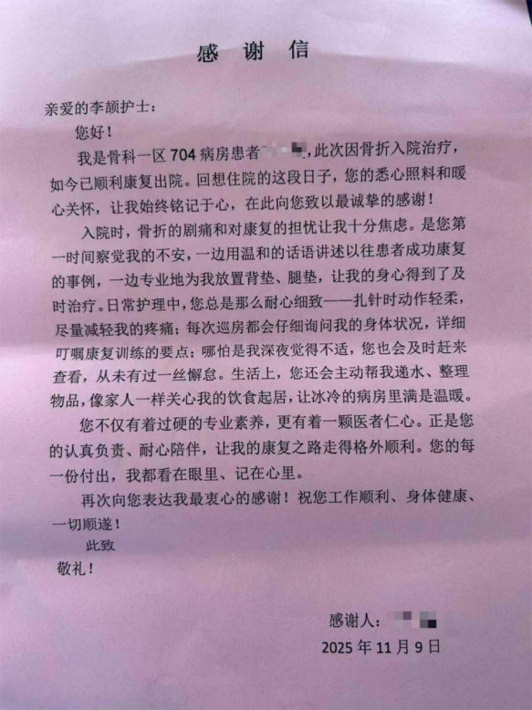 据该院介绍,这样一封朴实的感谢信,既是患者对个体护理的认可,更是对医院“以患者为中心”服务理念的生动注解。未来,该院将持续以专业为基、以温情为桥,让每一位患者都能在康复路上,感受到“被重视、被温暖”的力量。