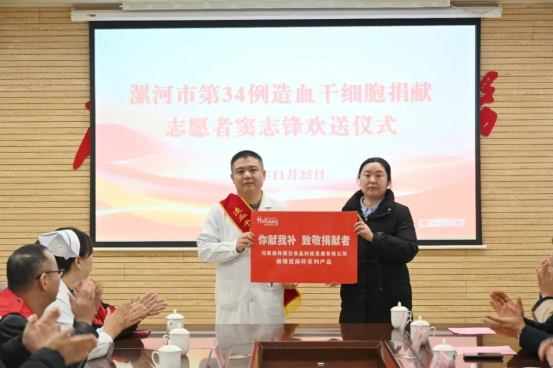 医药卫生网讯(记者王明杰 通讯员谢静 佟博)11月25日上午,漯河市第34例造血干细胞捐献志愿者窦志锋欢送仪式在临颍县人民医院举行。漯河市红十字会党组书记、常务副会长孙颍华,漯河市卫生健康委党组成员、副主任郭玉鸽,临颍县委常委、宣传部部长、政府副县长、县红十字会会长李红伟,漯河市文明城市建设服务中心副主任王婷婷,临颍县卫生健康委一级主任科员吴孝伟,县红十字会常务副会长李新征,县委宣传部八级职员田晓锐,县人民医院党委书记、院长封俊霞,漯河市第31例造血干细胞捐献者、临颍一高教师王余龙,市红十字会造血干细胞捐献志愿者及相关科室人员参加欢送仪式,漯河市红十字会党组成员、副会长李世杰主持仪式。