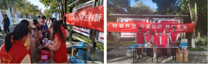 活动现场氛围庄重而热烈,市疾控中心还在篮球场及食堂门口设立咨询台,摆放宣传展板,向学生们分发着宣传单、安全套与红丝带等宣传品,营造出浓厚的防艾宣传氛围。