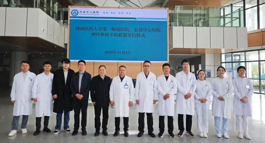 医院神经外科联盟签约揭牌仪式成功举行。近日,河南医药大学第一附属医院与息县中心医院神经外科联盟签约暨揭牌仪式顺利举行,7位神经外科省级专家将长期驻扎该院。此次联盟搭建起优质医疗资源共享平台,将推动省级神经外科先进技术、管理经验向县域下沉,助力医院神经外科诊疗能力提升,为县域脑血管疾病等患者提供更优质的诊疗服务。