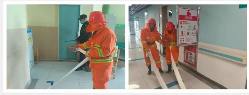 在火情处置环节,医院消防力量梯次投入:第一梯队医护人员迅速使用消防灭火器开展初期扑救;第二梯队微型消防站及后勤灭火组火速抵达,熟练操作消火栓控制火势;同时,电源切断、排烟启动等一系列操作有序展开,全力遏制火灾蔓延。