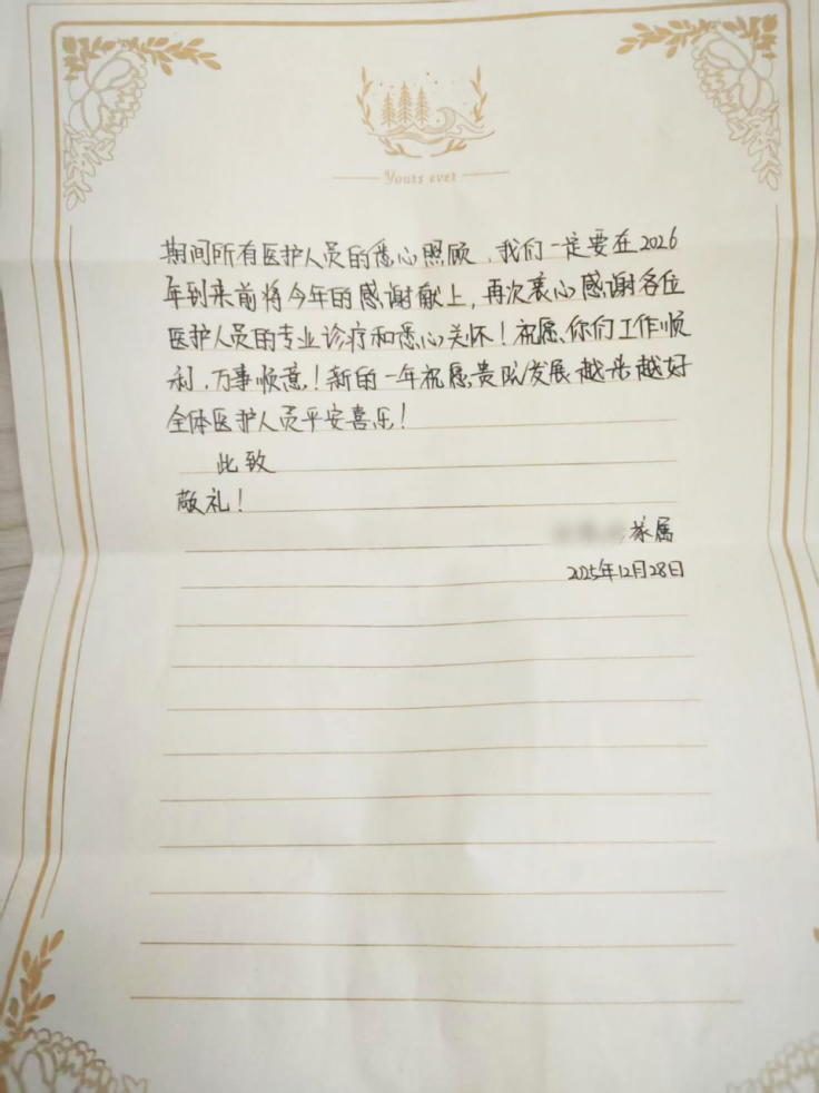 2026年新年将至,家属特意送来这封感谢信,字里行间满是诚挚:“一定要在今年将感谢献上,衷心感谢各位医护的专业诊疗与悉心关怀!”信末,家属还送上美好祝愿:“愿你们工作顺利,祝医院发展越来越好,全体医护平安喜乐!”