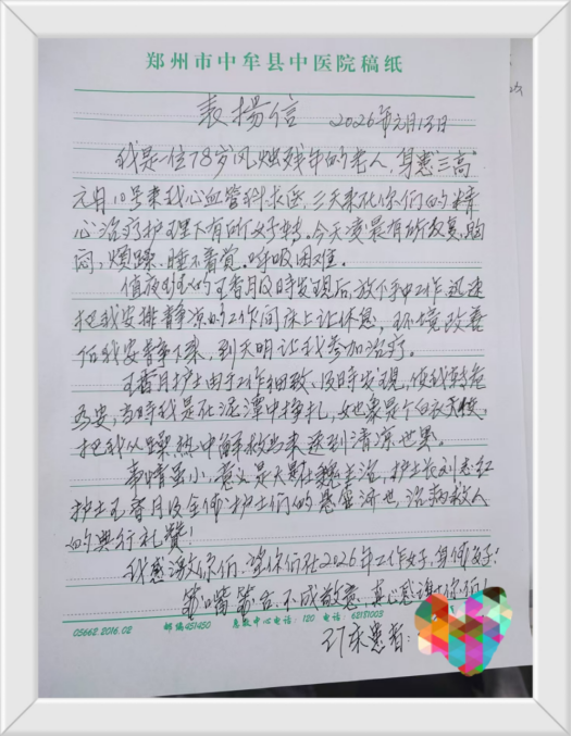 2026-1-19 来源:医药卫生网 - 医药卫生报 浏览:次医药卫生网讯(记者李志刚 通讯员邢景龙)近日,中牟县中医院心血管科收到一封情真意切的手写感谢信,普通信笺,墨香氤氲。“事情虽小 情真意切”患者以一笔一划的朴实字迹,记录自己在住院期间的一次温暖经历,在平实的叙述中自然流露、沁润人心。
