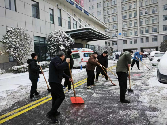 清扫现场,大家分工协作、干劲十足,有人挥舞铁锹破冰除雪,有人手持雪铲清扫路面,有人配合铲车打通主干道,还有人在门诊楼前、住院楼通道等重点区域铺设防滑物资。