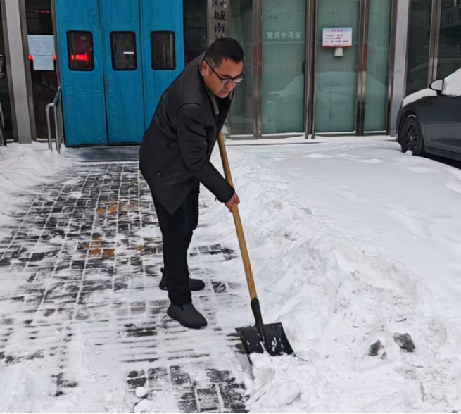 当天,城南社区卫生服务中心第一时间启动应急响应机制,开展由主要领导牵头的扫雪除冰工作,号召党员干部带头冲锋,职工主动参与,形成“领导带头、党员先行、职员上阵”的工作格局。同时,提前储备铁锹、扫帚、防滑垫等物资,聚焦中心出入口、门诊大厅门前等重点区域,开展扫雪除冰工作。党员干部带头扛起铁锹、拿起扫帚,对积雪较厚路段集中攻坚,后勤保障人员持续巡查,动态清理新飘落积雪,确保就医通道无积雪、无结冰、无隐患,为就诊患者提供安全畅通的通行环境。
