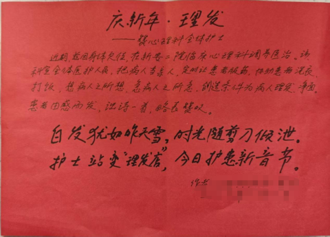 2026-1-21 来源:医药卫生网 - 医药卫生报 浏览:次医药卫生网讯(记者刘永胜 通讯员武剑 王兴莉)近日,新安县第二人民医院临床心理科护士站的桌面,悄然多了一张字迹工整的便笺纸。纸上是患者手写的七言小诗,笔墨虽朴拙,却字字揉着暖意,将病房里一场特殊的“理发”,酿成了护患之间最动人的新年风景。