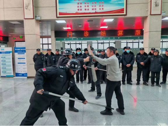演练模拟了在门诊、病区等发生突发暴力侵害事件的场景。随着保卫科科长郝树森一声令下,演练正式启动。最小应急单元参演队员在应急小组的指挥下,闻令而动,迅速进入实战状态。他们严格按照“二对一”“三对一”等战术协同要求,分工明确、配合紧密,围绕防卫、阻挡、制服、报告等关键环节展开规范操作。整个过程中,队员们反应敏捷、动作果断,战术运用得当,流程执行清晰,经过团队协作成功控制了模拟事态。