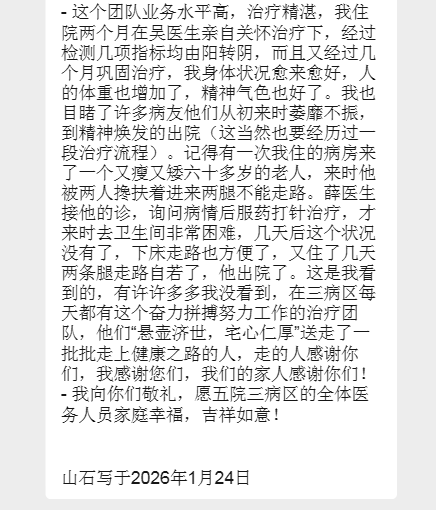 2026-1-27 来源:医药卫生网 - 医药卫生报 浏览:次医药卫生网讯(记者王明杰 通讯员沈佩)信阳市第五人民医院1月27日介绍,一直以来,该院始终秉持“以患者为中心,以质量为核心”的服务理念,用精湛的医疗技术、优质的护理服务,守护着一方百姓的健康。近日,该院院长微信收到患者陈先生的感谢信,这份特殊的“礼物”,字里行间满是对结核科呼吸三病区全体医护人员的认可与感恩,也承载着患者对医院的信任与肯定。