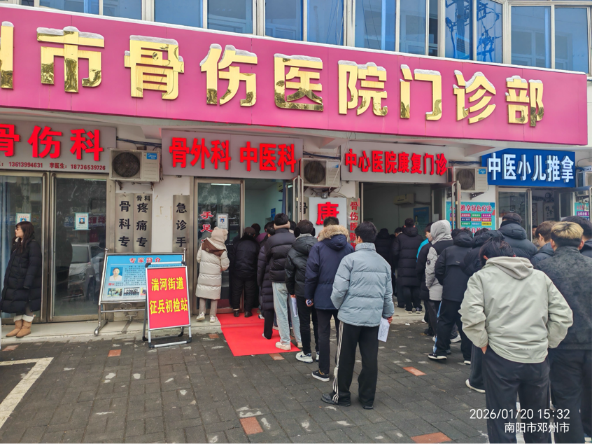 2026-1-28 来源:医药卫生网 - 医药卫生报 浏览:次医药卫生网讯(记者乔晓娜 通讯员崔伟)1月21日,邓州市湍河社区卫生服务中心(邓州市骨伤医院)作为湍河街道办事处指定的2026年度征兵体检预检机构,以守护国防初心为导向,直面1月20日大雪引发的路滑、低温等不利因素,科学调整体检时间、细化应急保障,全力为47名适龄青年提供精准规范的体检服务,扎实推进首日征兵预检工作,以实际行动为输送优质兵员筑牢健康防线。