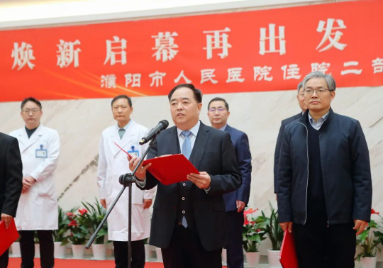 张天增在致辞中说,近年来,市委、市政府始终把保障群众就医需求、提升医疗服务水平摆在重要位置,锚定健康濮阳建设目标,持续推动医疗资源提质增效。濮阳市人民医院作为全市医疗卫生服务体系的中坚力量,紧贴群众就医需求,对住院二部进行系统改造提升,既是盘活存量资源、补齐服务短板的务实举措,更是深化医药卫生体制改革、推动医疗服务高质量发展的生动实践。住院二部的焕新启用,将有效缓解群众住院就医压力,为广大患者提供更舒适、安全、高效的诊疗服务,对构建优质高效的医疗卫生服务体系、满足群众日益增长的健康需求具有重要的现实意义。希望市人民医院以此为新起点,以“硬件升级”带动“软件提质”,持续提升诊疗技术与服务品质,让新环境、新设施真正转化为群众看得见、摸得着的就医获得感,努力打造党和政府放心、人民群众满意的现代化医院。