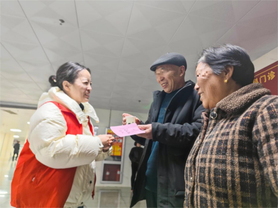 服务队伍由当日值班的职能科室中层干部带队,配备4名行政后勤人员。他们身着醒目的红色志愿服,主动为患者及家属提供细致的帮助:从导诊咨询、协助使用掌上医院、报告打印,到陪伴行动不便或年长患者取药、协助检查……志愿者的身影穿梭在门诊各环节,成为医院里一道温暖的风景。