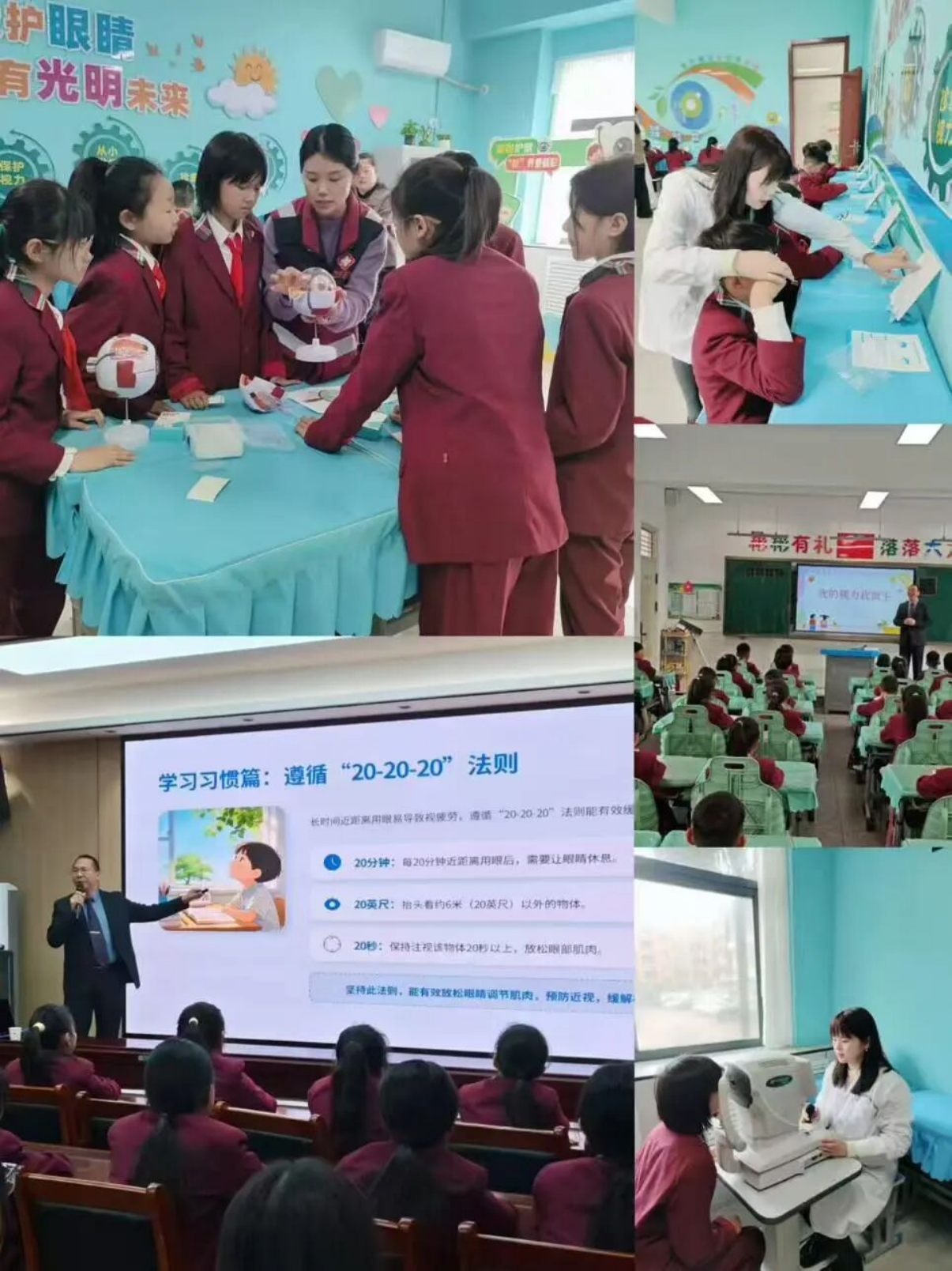 仪式结束后,相关领导一行实地参观了“爱眼小屋”的视力检测区、科普宣传区、视力训练区等三大功能区域。同学们在老师引导下有序参与体验活动,通过眼球模型、光学教具等,近距离学习护眼知识,护眼知识真正“动”了起来,变成了学生能听懂,能玩的东西。同时市预防保健门诊部眼科主任张建锋为在场师生带来了一堂生动有趣的近视防控科普课。