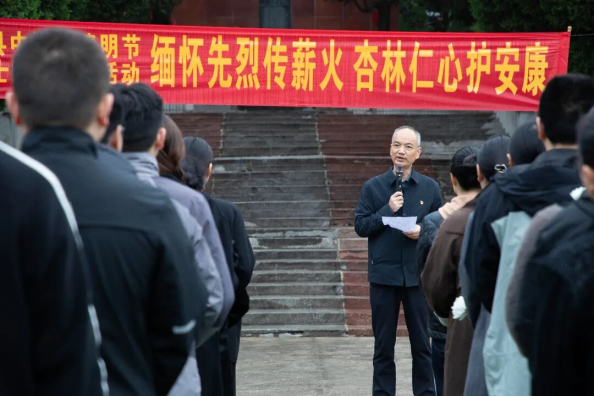苍松翠柏环绕,陵园庄严肃穆,革命烈士纪念碑巍然矗立,诉说着先辈们不畏艰险、浴血奋战的英雄事迹。参与祭扫的医院工作人员身着整洁服装,手拿鲜花,神情庄重,列队整齐,聆听着秦院长的致辞,开启这场意义非凡的缅怀之旅。