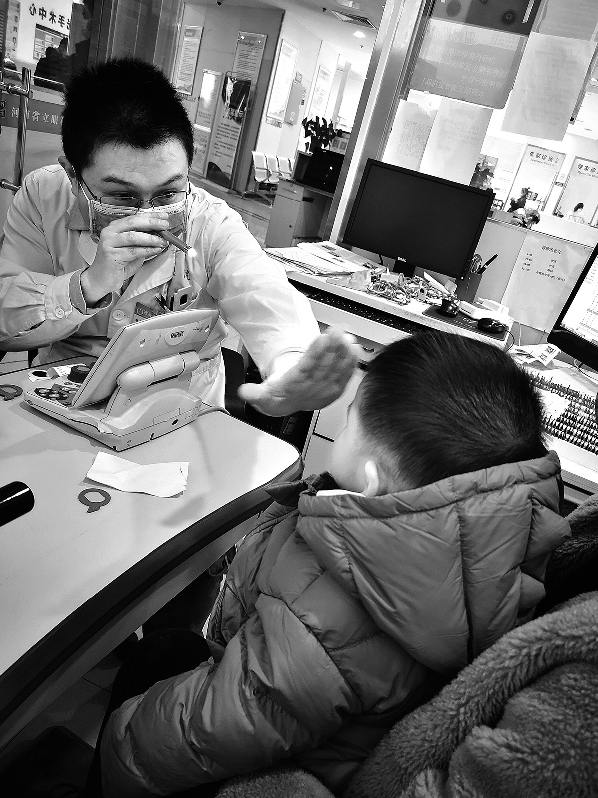 ←12月15日,在河南省立眼科医院,医务人员正在为小朋友进行视力筛查。如果孩子定期进行视力筛查,医务人员就可以给孩子建立屈光发育档案,及时发现孩子的眼部问题,保障孩子眼健康,从而做到早发现、早治疗。 冯金灿 张浥尘/摄