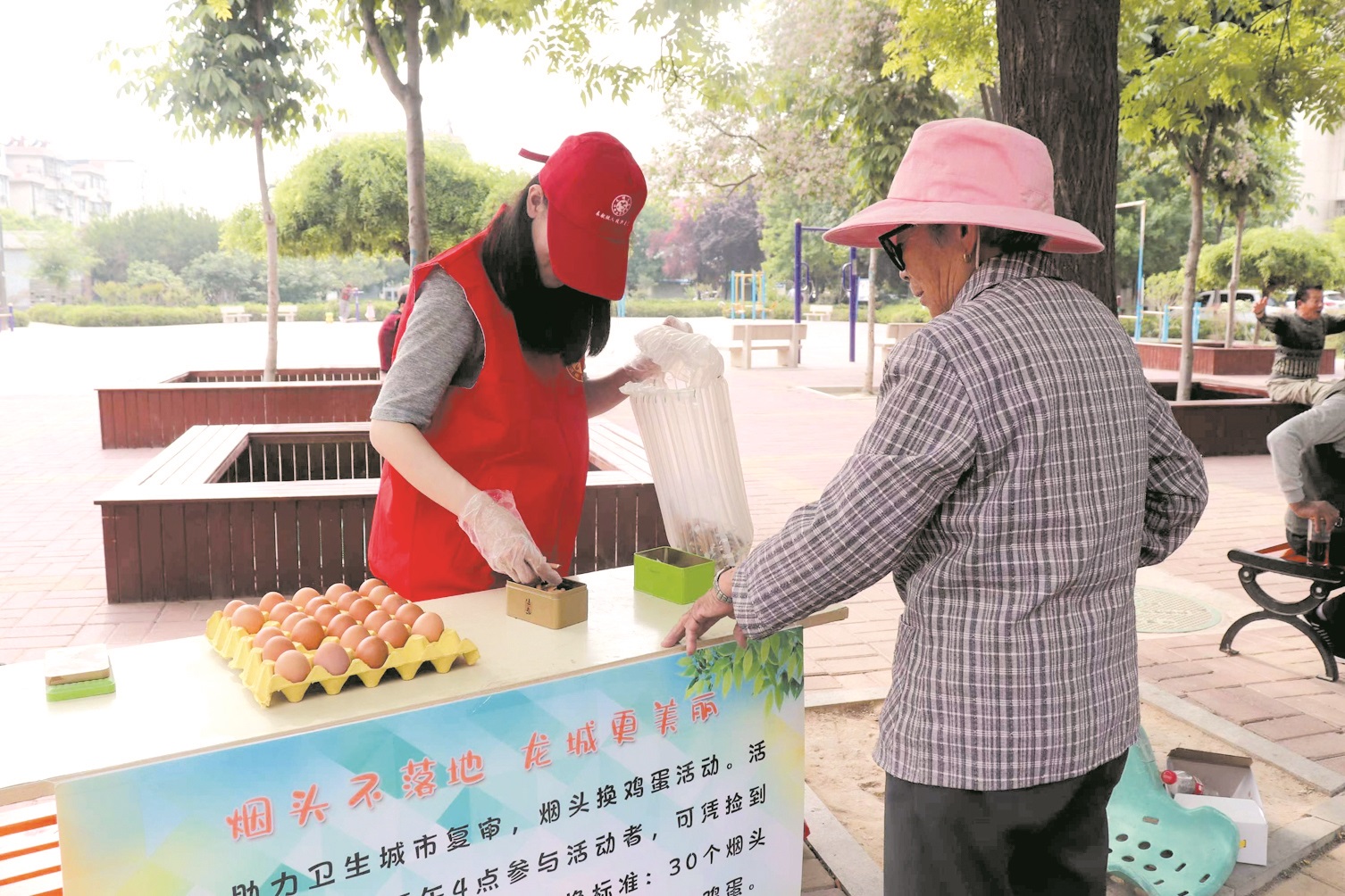 濮阳市华龙区任丘路街道办事处登月社区党支部开展“烟头不落地 龙城更美丽”烟头兑换鸡蛋活动