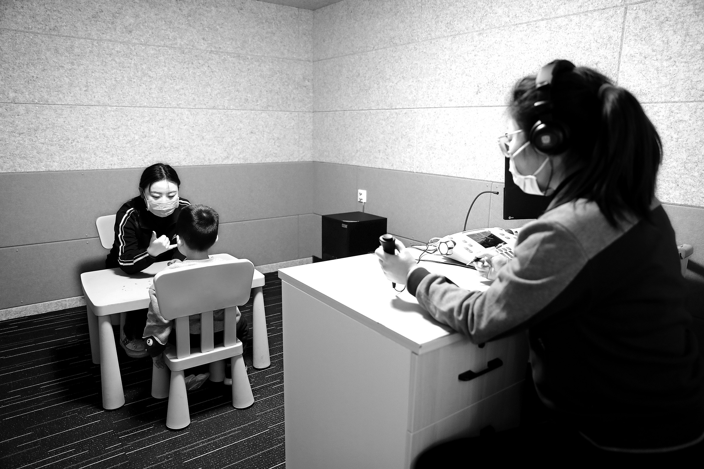 2021年12月30日,在三门峡市中心医院,发育行为科医务人员正在为小朋友检测听力。近日,三门峡市中心医院成功创建河南省儿童语言康复医学重点(培育)实验室,对建立儿童语言功能的早期筛查、早期诊断、早期治疗和康复体系,降低儿童致残率具有很大的推动作用。 汤剑燕 牛鹏磊/摄