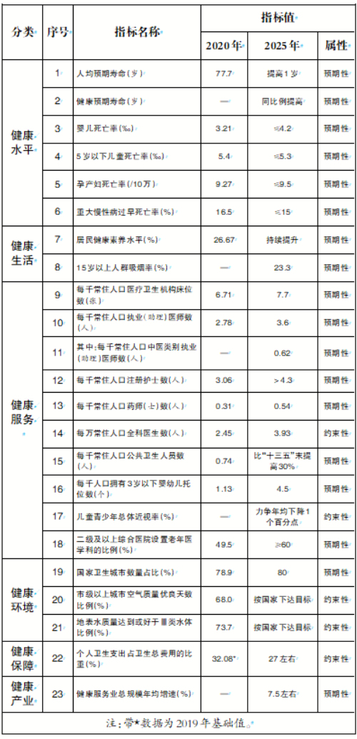 根据《规划》,2025年,河南卫生健康工作要实现促进全民健康的政策体系基本建立,六大创新体系建设取得新突破,健康服务能力明显提升,突发公共卫生事件应对能力更加稳固,居民主要健康指标全面优于全国平均水平等目标。具体目标包括全省人均预期生命要比2020年提高1岁、每千常住人口医疗卫生机构床位数达到7.7张、个人卫生支出占卫生总费用的比重下降到27%左右等。