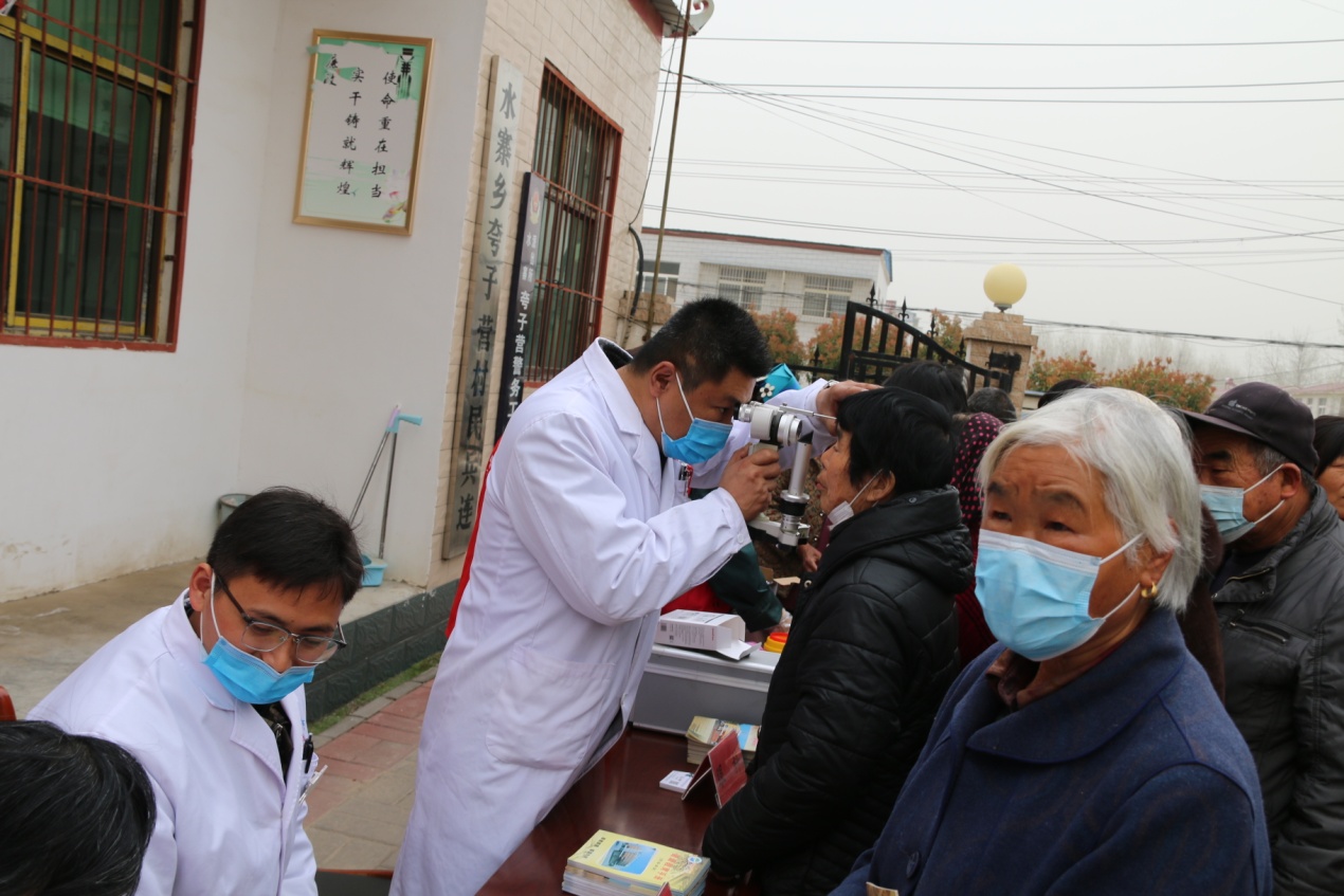 ↑4月14日,叶县中医院医务人员为患者检查眼部疾病。当天,该院义诊团队到水寨乡夸子营村为村民提供白内障筛查、心电图检查等服务,并进行用药指导。 王 平/摄