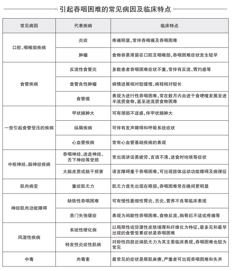 针对吞咽困难本身的问诊:发病情况,有无诱因,起病缓或急,病程长或短;吞咽困难特点,是进行性、持续性,还是间歇性,吞咽固体还是液体食物困难等。