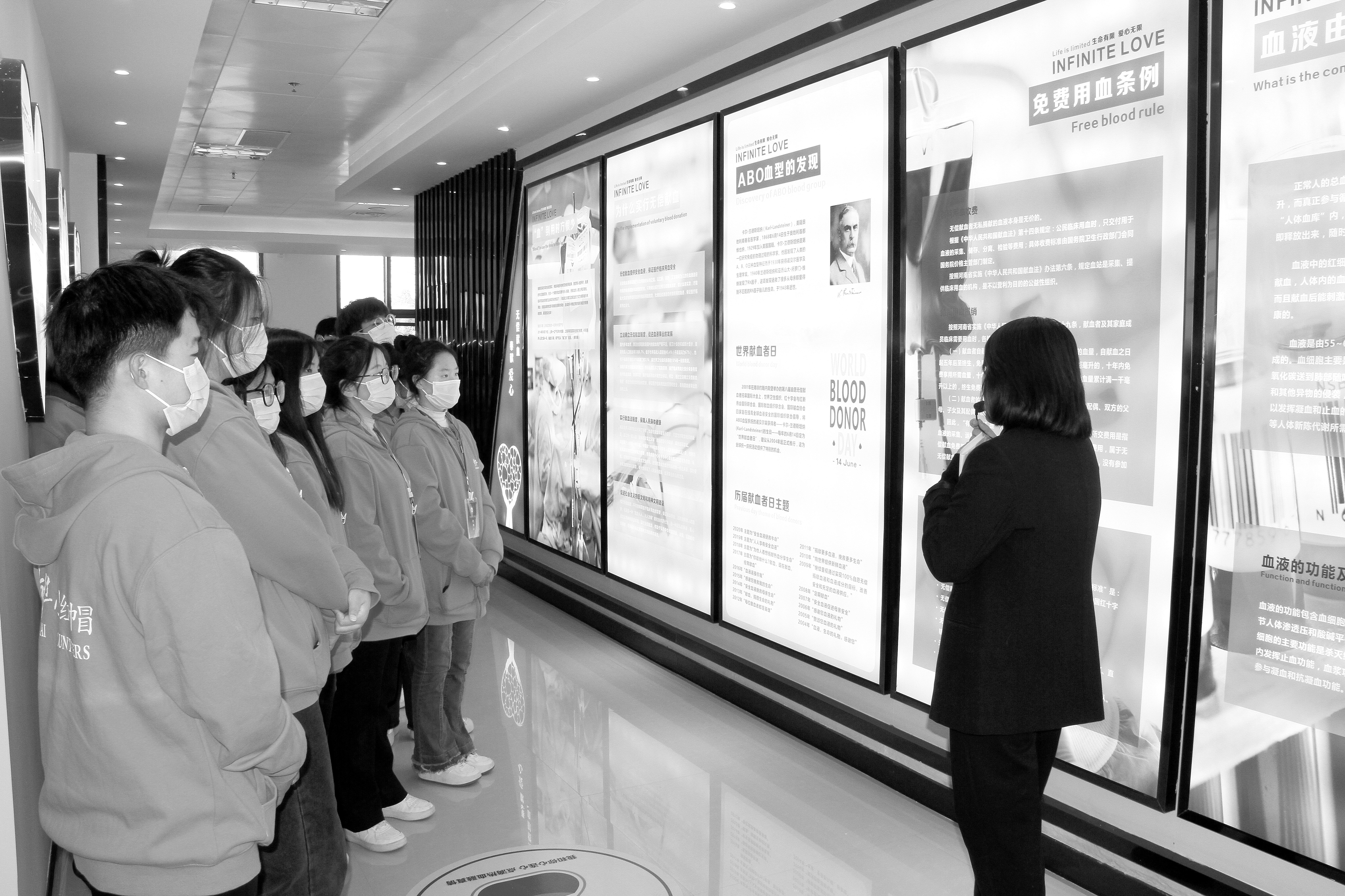 近日,在驻马店市中心血站,工作人员为学生普及无偿献血知识。当天,黄淮学院校团委组织50名大学生志愿者走进驻马店市中心血站开展血站开放日活动,促进大学生深刻认识参与无偿献血的重要意义,“零距离”探秘血液旅程。 丁宏伟 高 鹏 张 暖/摄