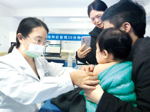 在焦作市武陟县龙泉街道社区卫生服务中心预防接种门诊,市民带着孩子前来接种疫苗