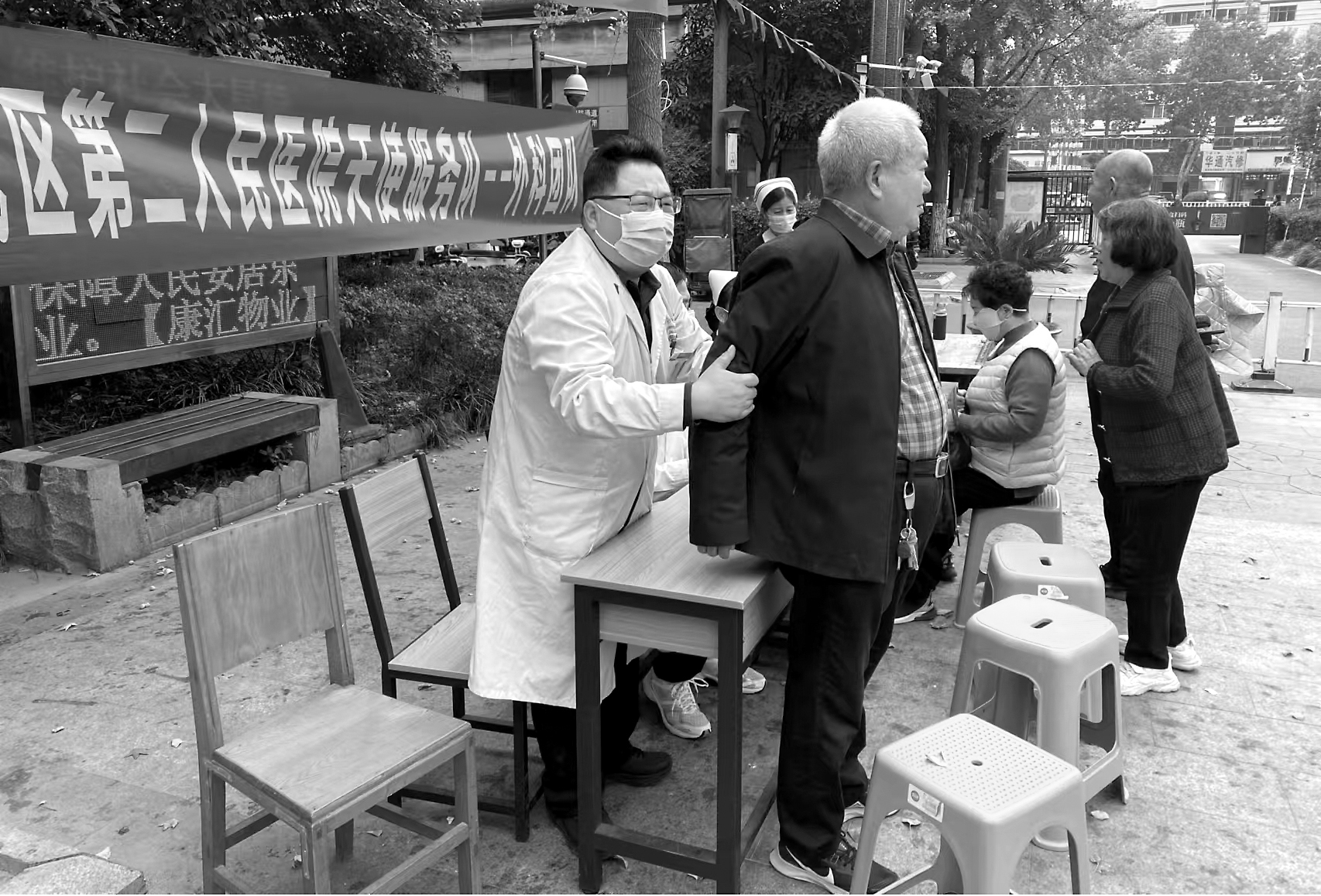 ↑近日,在漯河市郾城区一个社区,医务人员为群众示范关节拉伸技巧。当天,漯河市郾城区第二人民医院外科团队在社区开展义诊活动,为建设健康社区贡献力量。
