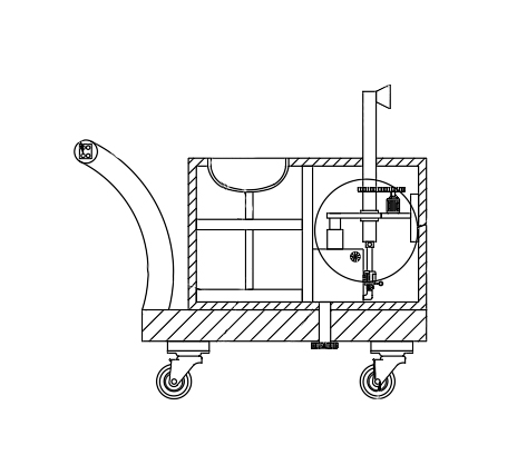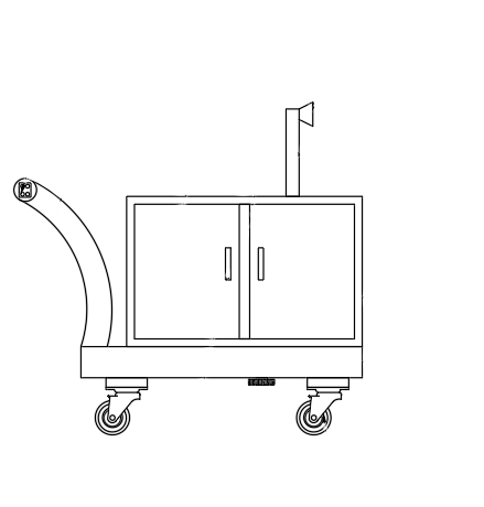 基座的表面对称活动连接有箱门,箱门的表面对称固定安装有把手。消毒箱的底部固定连通有出液口,该出液口的一端贯穿基座的顶部并延伸至基座底部外侧。消毒箱的表面设置有进液口,其一侧固定连接有水泵,水泵的输入端与输出端均通过连接管固定连通,且连接管的一端与喷洒管的底部固定连接。基座一侧的顶部固定安装有扶杆,扶杆的一端固定设置有控制器。基座底部的4个拐角处对称固定安装有万向轮。