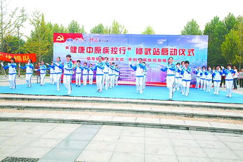 10月17日,修武县的一些市民正在跳健身操。当天,由修武县疾病预防控制中心承办的“健康中原疾控行”修武站启动仪式暨大型健步走活动在县城宁城公园举行。开展此次活动,目的是动员广大群众学习健康知识,以提高健康素养。