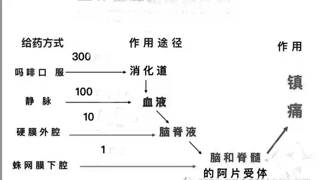 “我们经常用到的阿片类止痛药,有一个特点,就是到达大脑中枢神经系统后才能起到止痛作用,因此又叫中枢性止痛药。但是,我们口服300毫克吗啡的时候,由于胃肠道吸收能力有限,最多只能吸收1/3左右(大约100毫克)到身体的血液里面。然后,这1/3的药物随着血液的流动到达全身,最后到达大脑、起到止痛作用的约1/100,也就是1毫克左右。说白了,吃了300毫克药物,只有1毫克能起到止痛效果,剩下的299毫克,要么没有被吸收,要么和外周的受体结合,产生的不是镇痛作用,而是恶心、呕吐、便秘等不良反应。”