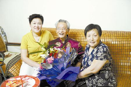 党委关心老职工生活,为90岁老职工过生日,图为院党委副书记丁凡和老同志合影。
