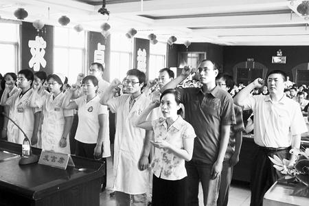 “七一”前夕,鹤煤总医院举办了“庆祝中国共产党建党89周年暨表彰大会”。会上对在去年工作中涌现出的4名优秀党务工作者、44名优秀共产党员和3个先进党支部进行了表彰。图为15名新党员在鲜红的党旗下进行了庄严的入党宣誓。 杨 虹 王飞霞 张治平/摄
